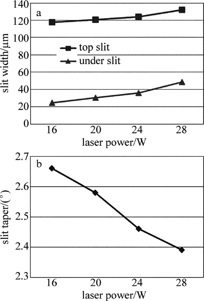 激光能量是切割過程得以進行的主要能量來源,功率大小將直接影響切割時的能量密度。圖 6為采用脈沖頻率50Hz、切割速率30mm/min、激光功率分別為16W, 20W, 24W, 28W時,切縫寬度與錐度隨功率的變化情況。由實驗可知,激光功率對切縫寬度和錐度有重要影響,隨著功率的增大,切縫寬度增大錐度減小,材料去除量增加。