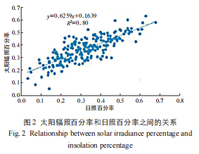 根據(jù)本光伏電站所在地附近的4 個(gè)氣象站( 興仁站、水城站、威寧站、紫云站) 在2011 年1 月至2016 年2 月期間觀測(cè)得到的各月太陽輻照量數(shù)據(jù)與日照時(shí)數(shù)數(shù)據(jù),分別計(jì)算得到各月的太陽輻照百分率( 即Q/Q0) 和日照百分率,為分析這二者之間的關(guān)系,將相應(yīng)數(shù)據(jù)繪制到坐標(biāo)系中,具體如圖2 所示。