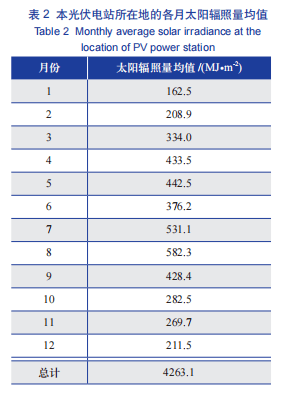 從表 2 可以看出:本光伏電站所在地的全年總太陽輻照量為4263.1MJ/平方米 。